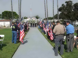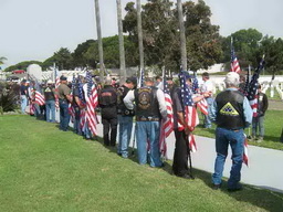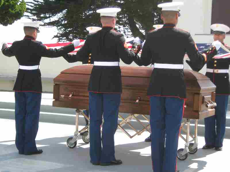 The veterans stood in line, holding flags as the wooden, flag-draped casket carried by six Marines in dress blues passed on the sunny afternoon. The hum of Naval aircraft was heard in the background, doing training exercises for today's wars. Family members wore dog tags with Richard Rivenburgh's picture.